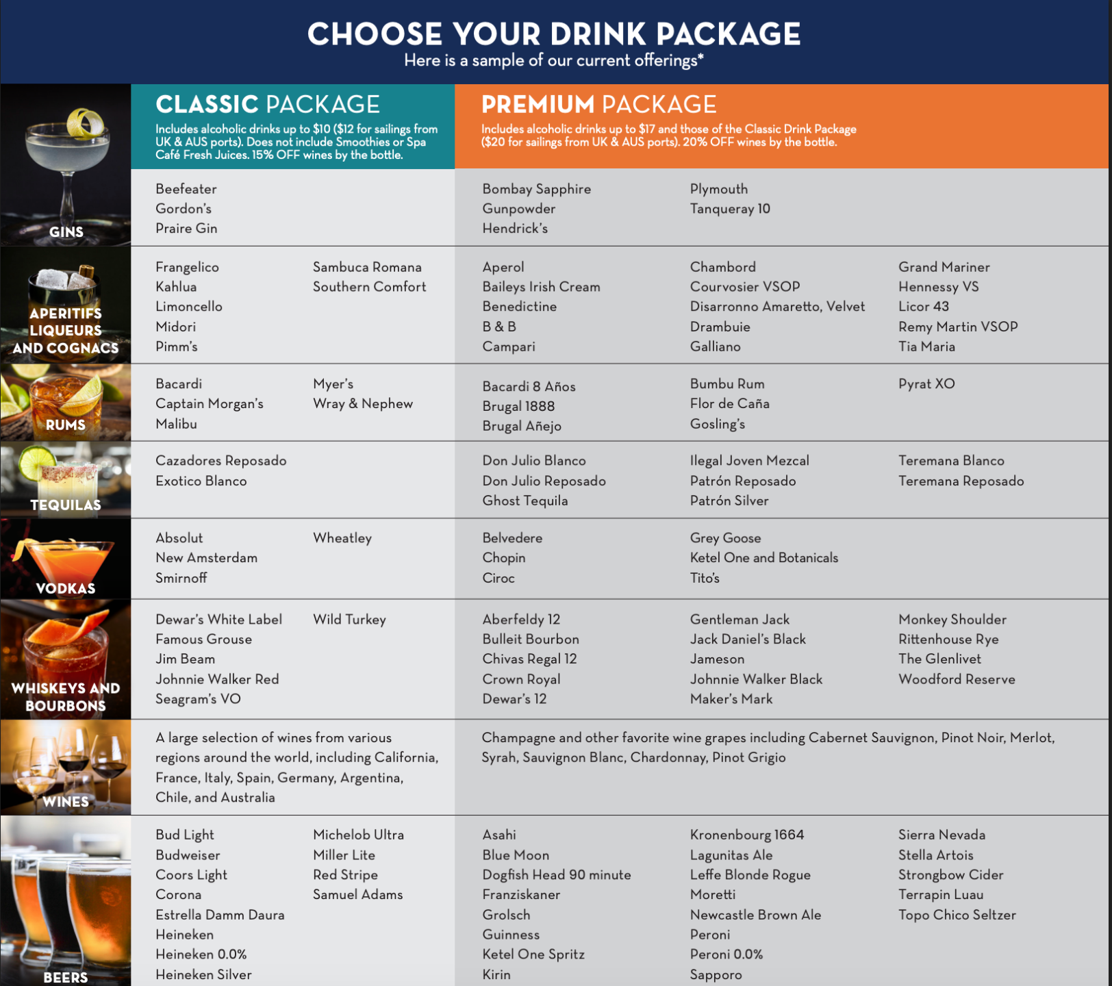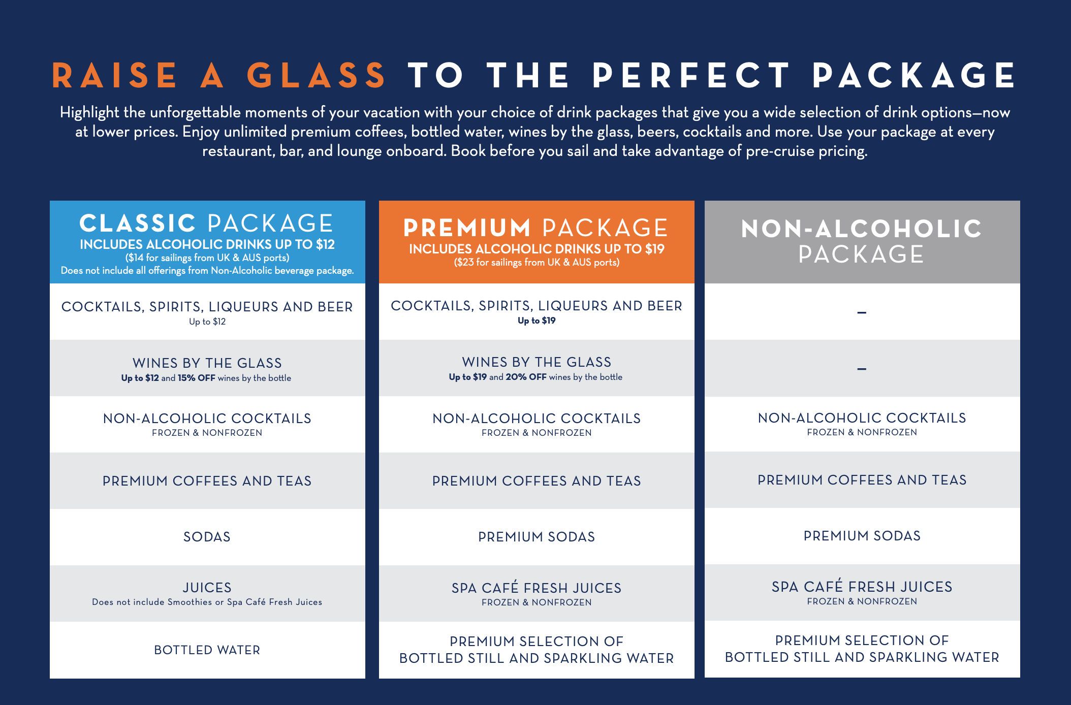 Specific beverage offerings are subject to availability and change. Package prices vary by ship, itinerary, and length and may reflect an additional tax for certain ports or itineraries. All guests of legal drinking age in the same stateroom and under the same stateroom booking number are required to purchase the same alcoholic beverage package. Guests can contact call centers or notify onboard staff to request a modification to the Non-Alcoholic package instead.
